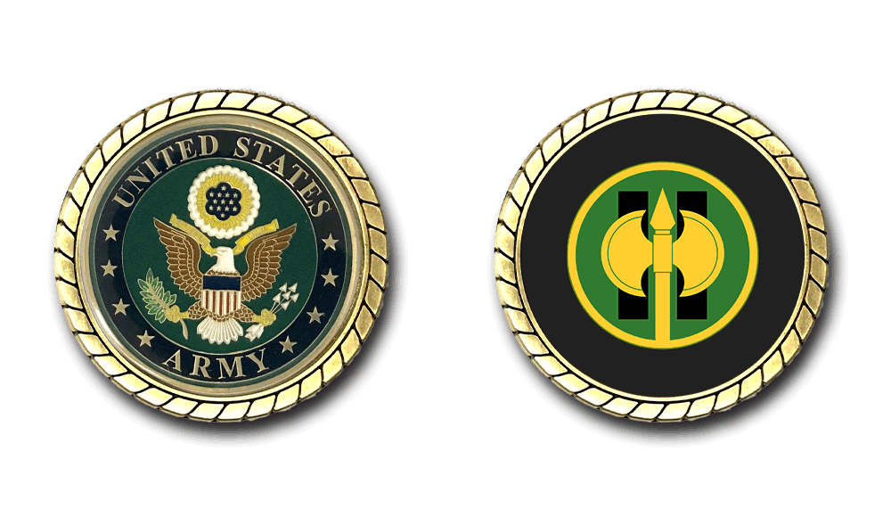 Please enjoy this U.S. Army Officially Licensed Challenge Coin. This coin is approximately 1.75 inches in size, is a 2 sided coin and is of the highest quality.