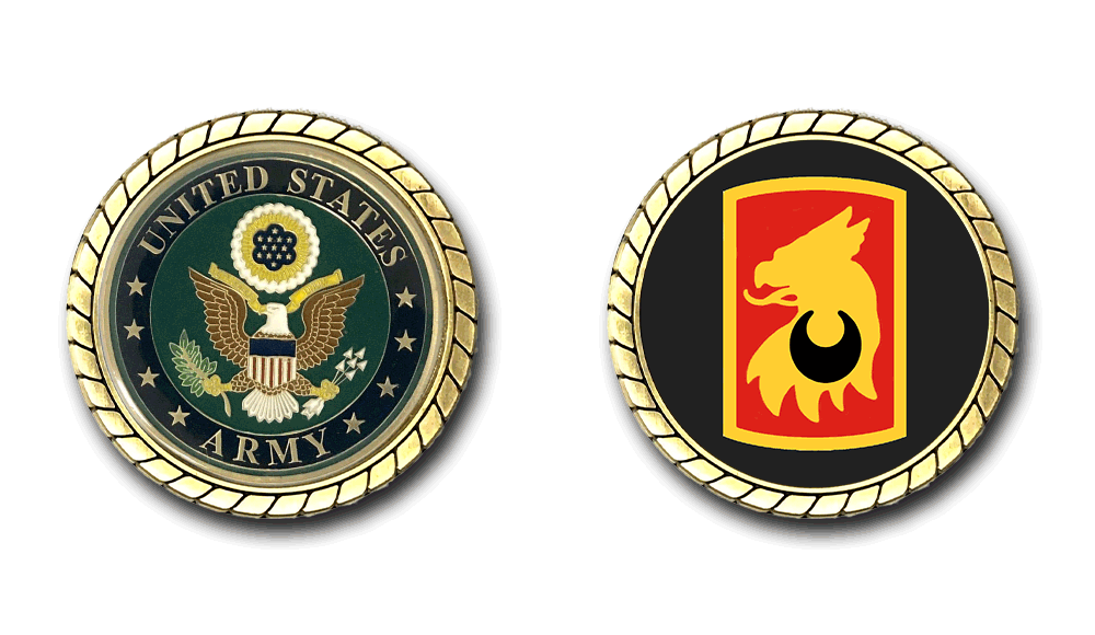 Please enjoy this U.S. Army Officially Licensed Challenge Coin. This coin is approximately 1.75 inches in size, is a 2 sided coin and is of the highest quality.