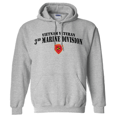 Please enjoy this US Marine Corps officially licensed 3rd Marine Division Vietnam Veteran OD Green Subdued Hooded Sweatshirt. It is 70-30% Cotton/Poly pre-shrunk Premium Cotton Adult Sweatshirt and is available in S, M, L, XL, 2X and 3X sizes. The Hoodie has a contrast dark grey flatcord and a Pouch pocket.