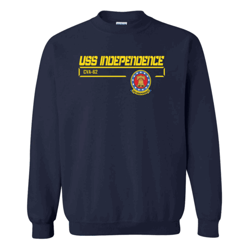 Please enjoy this US Navy officially licensed USS Independence CVA-62 Crest Sweatshirt. It is 70-30% Cotton/Poly pre-shrunk Premium Cotton Adult Sweatshirt and is available in S, M, L, XL, 2X and 3X sizes.