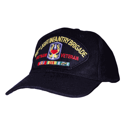 This 199th Infantry Brigade Vietnam Veteran Cap is a black cap and features a Velcro back adjustment strap. This is a very popular mid profile style cap. This is a polyester cap with a quilted sweat band inside and is a one size fits most cap. This 199th Infantry Brigade Vietnam Veteran Cap ships in 1-3 business days.