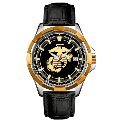 Aquaforce US Marine Corps EGA Gold-Black Leather Strap Analog Quartz Dress Watch
