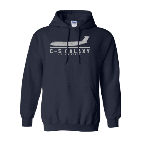 Please enjoy this Officially Licensed C-5 Galaxy Hooded Sweatshirt. It is 70-30% Cotton/Poly pre-shrunk Premium Cotton Adult Hooded Sweatshirt and is available in S, M, L, XL, 2X and 3X Sizes. The Hoodie has a contrast dark grey flatcord and a Pouch pocket.