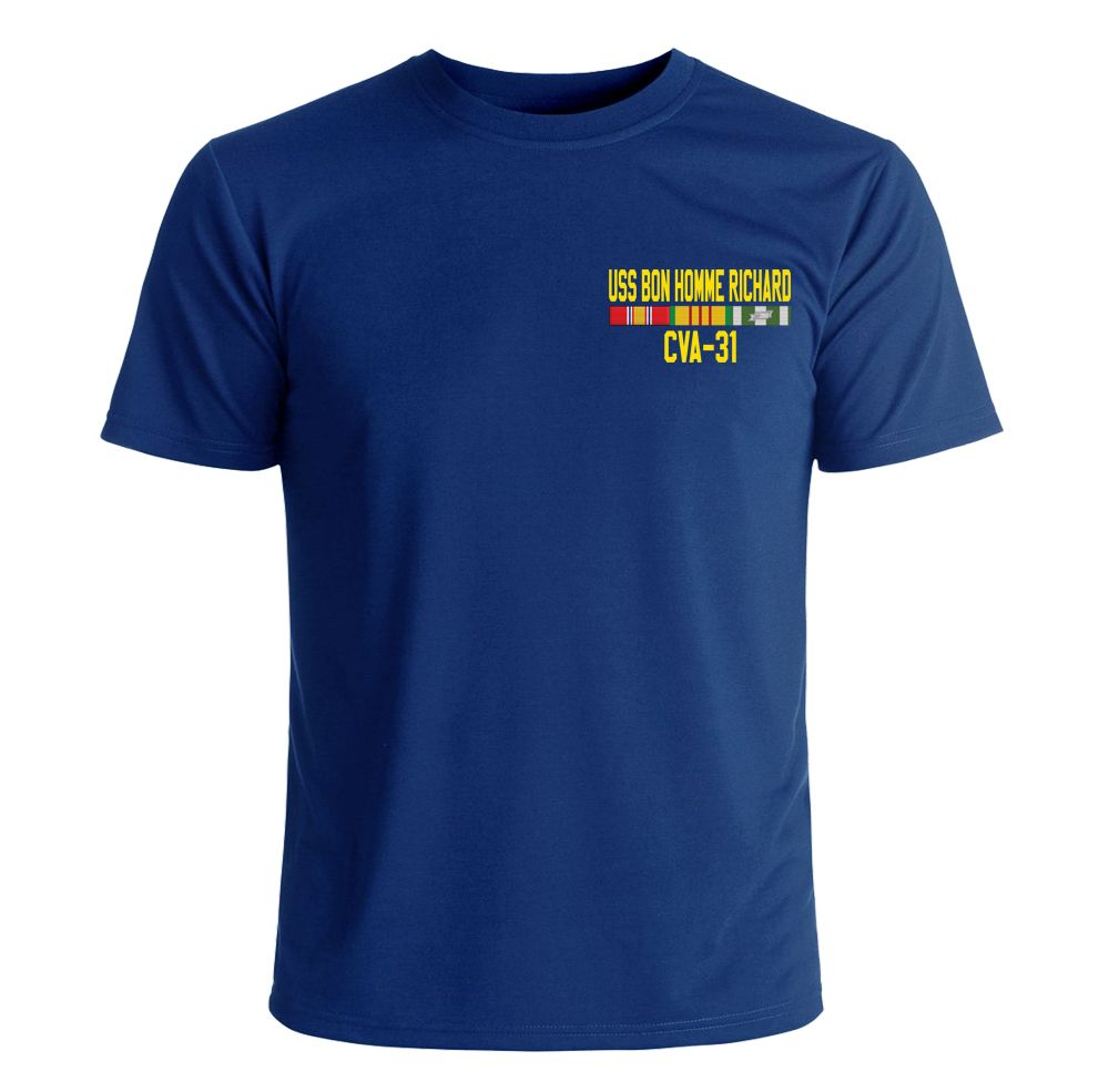 Please enjoy this US Navy officially licensed USS Bon Homme Richard CVA-31 With Vietnam Service Ribbons Left Chest T-Shirt. It is 100% pre-shrunk t-shirt and is available in M, L, XL, 2X, 3X and 4X sizes.