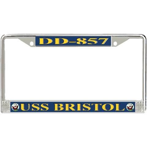 This Officially Licensed USS Bristol DD-857 License Plate Frame is Sublimated and Assembed from the quality finished metal alloy with UV resistant graphics. This Frame, a custom, personalized, bracket serves as a great looking holder, displaying your License Plate. Fits all standard US cars and trucks and shows your pride and service of the USS Bristol DD-857.