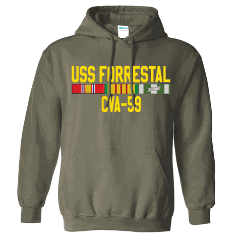 Please enjoy this US Navy officially licensed USS Forrestal CVA-59 With Vietnam Service Ribbons OD Green Center Chest Hooded Sweatshirt. It is 70-30% Cotton/Poly pre-shrunk Premium Cotton Adult Hooded Sweatshirt and is available in S, M, L, XL, 2X and 3X sizes. The Hoodie has a contrast dark grey flatcord and a Pouch pocket.