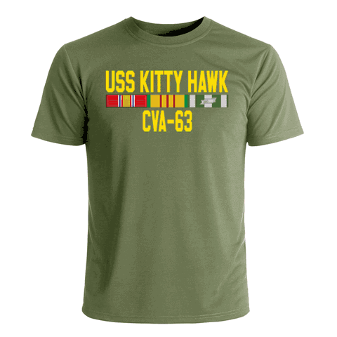 Please enjoy this US Navy officially licensed USS Kitty Hawk CVA-63 With Vietnam Service Ribbons OD Green Center Chest T-Shirt. It is 100% pre-shrunk t-shirt and is available in M, L, XL, 2X, 3X and 4X sizes.