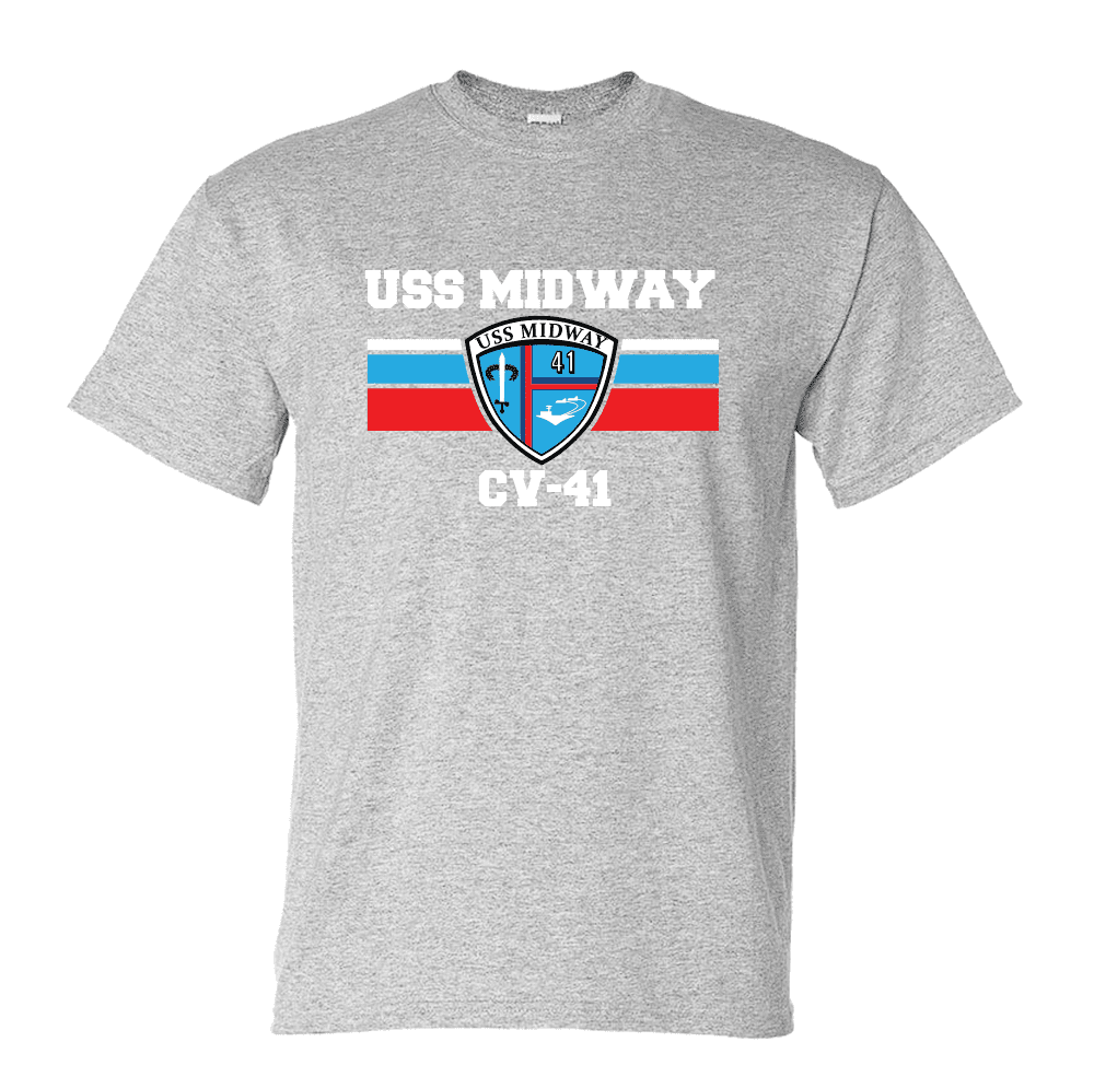Please enjoy this US Navy officially licensed USS Midway CV-41 Crest T-Shirt. It is 100% pre-shrunk navy blue shirt and is available in M, L, XL, 2X, 3X and 4X sizes.