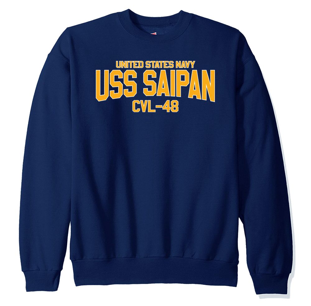Please enjoy this US Navy officially licensed USS Saipan CVL-48 Sweatshirt. It is 70-30% Cotton/Poly pre-shrunk navy blue or Gray Premium Cotton Adult Sweatshirt and is available in S, M, L, XL, 2X and 3X sizes.